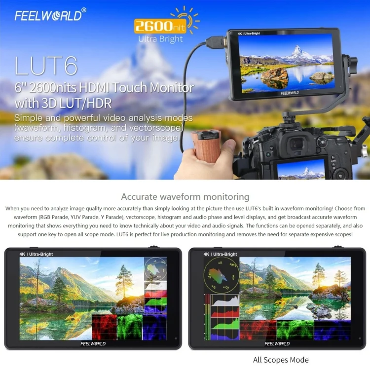 FEELWORLD LUT6 1920×1080 2600 nits 6 inch IPS Screen HDMI 4K Touch Control Camera Field Monitor