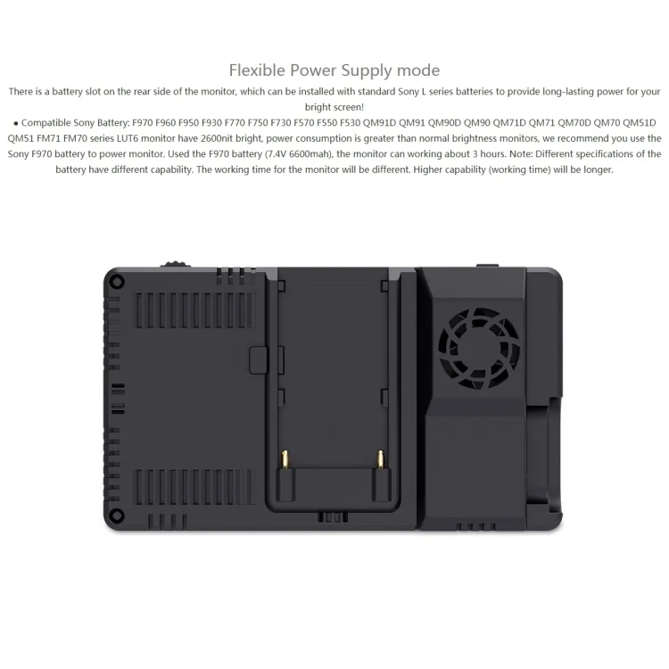 6. Through the 4K HDMI input of the monitor, it can be connected to various consumer cameras or digital SLRs. You can use its loop-through output interface to display live video or external display extensions and clips on the projector, with embedded audio. In addition, you can monitor audio through the 3.5mm stereo headphone jack. In terms of power supply, it has a 12V DC input interface and a NP-F battery slot. The back is equipped with a fan design, which can automatically dissipate heat according to the brightness of the backlight