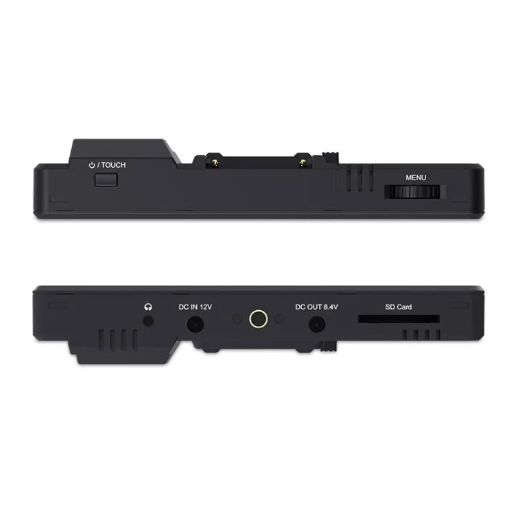 There is a large bright touch screen on the front, a signal interface on the left, an SD card slot at the bottom, and an NP-F battery on the back. There are standard 1/4-inch mounting points on the bottom and right side, which can be used to mount to cameras and other equipment