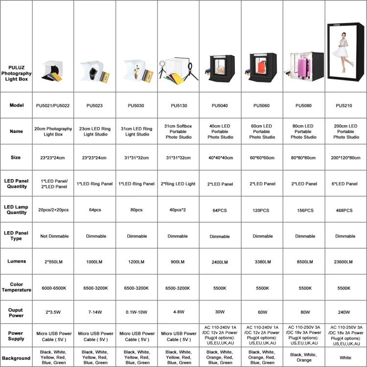 5. With 6 backgrounds pads, and build-in light and USB cable (You should prepare a usb charger to power it.).