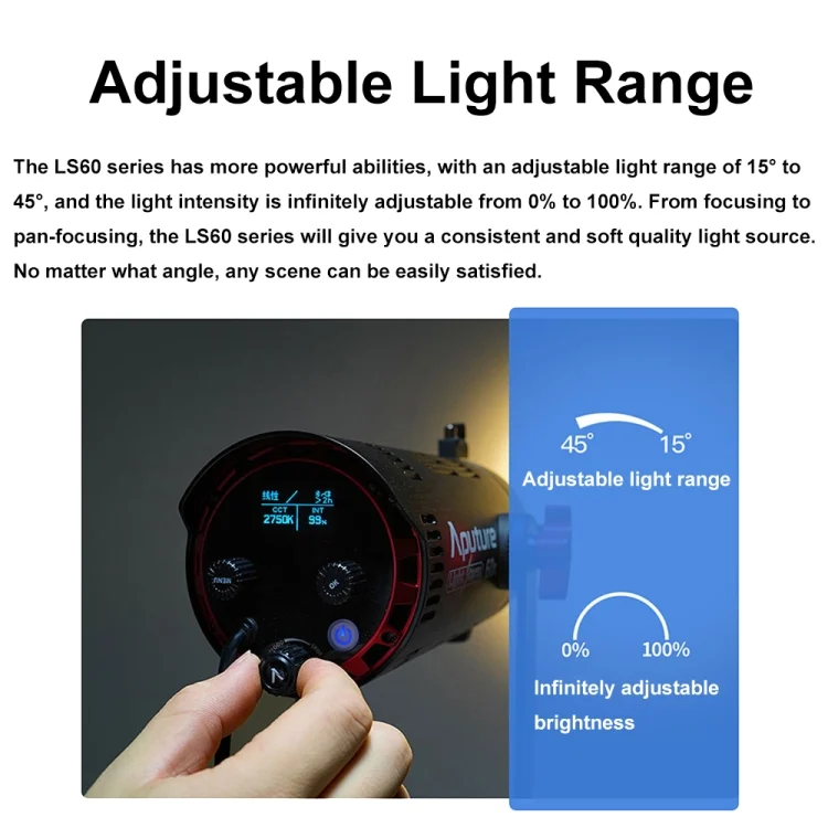 3. The LS60 series has more powerful capabilities, with an adjustable light range of 15°-45° and light intensity of 0%-100% infinitely adjustable. From focusing to pan-focusing, the LS60 series will give you a consistent and soft quality light source. No matter what angle, any scene can be easily satisfied.