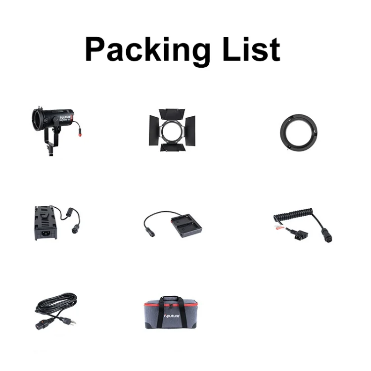 -LS 60X: photography light, eight-page sunshade, adapter ring, adapter, battery box, D-tap to DC cable, power cord, handbag