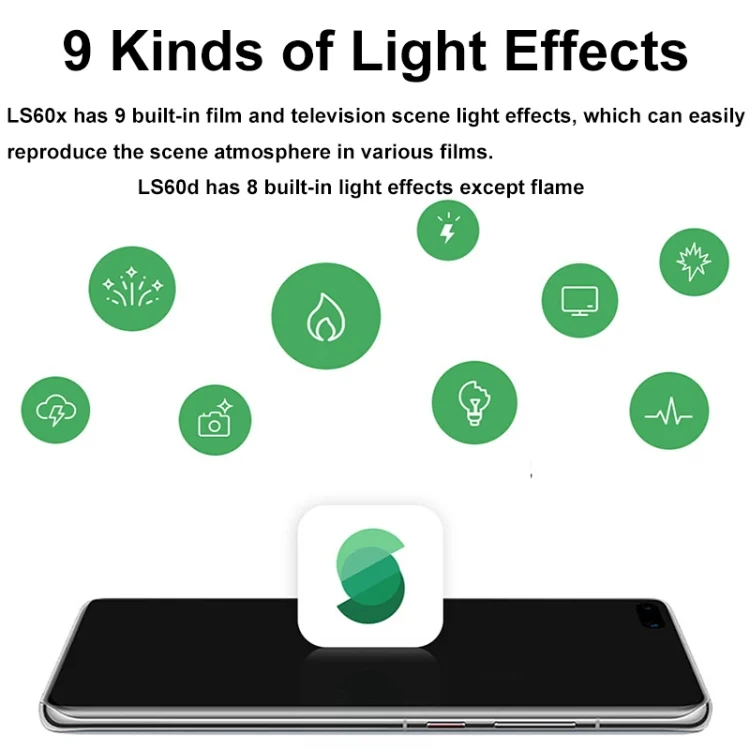 7. The LS60x has 9 built-in film and television scene light effects, which can easily reproduce the scene atmosphere in various movies. The LS60d has 8 built-in light effects except flame.