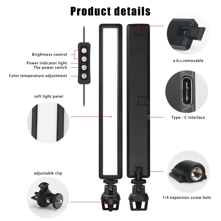 3. Adjustable position of 1/4 screw interface: The back of the WS66 LED light has other two positions for you to adjust the 1/4 screw interface position.It comes with two installation tools. One is an adjustable clip, which is suitable for iMac and laptop; the other is a 3-level height adjustment stand, which can be adjusted to a suitable height.