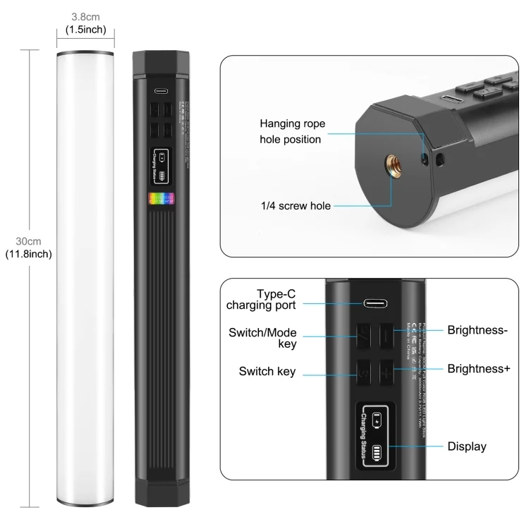 6. Various ways of use: The stick light can be held by hand; each end has a universal 1/4-inch screw hole, which can be connected to tripods, handles, selfie sticks and other photography accessories;