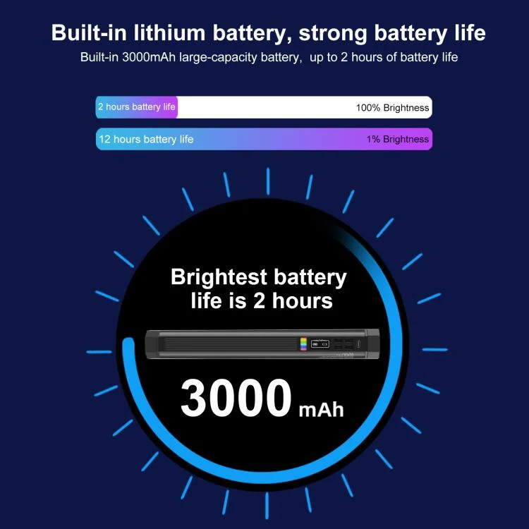 5. Large-capacity battery: Built-in 3000mAh rechargeable battery. It can be used continuously for 3 hours at maximum brightness and 30 hours at minimum power; it can also be used while charging, so there is no need to worry about insufficient power;