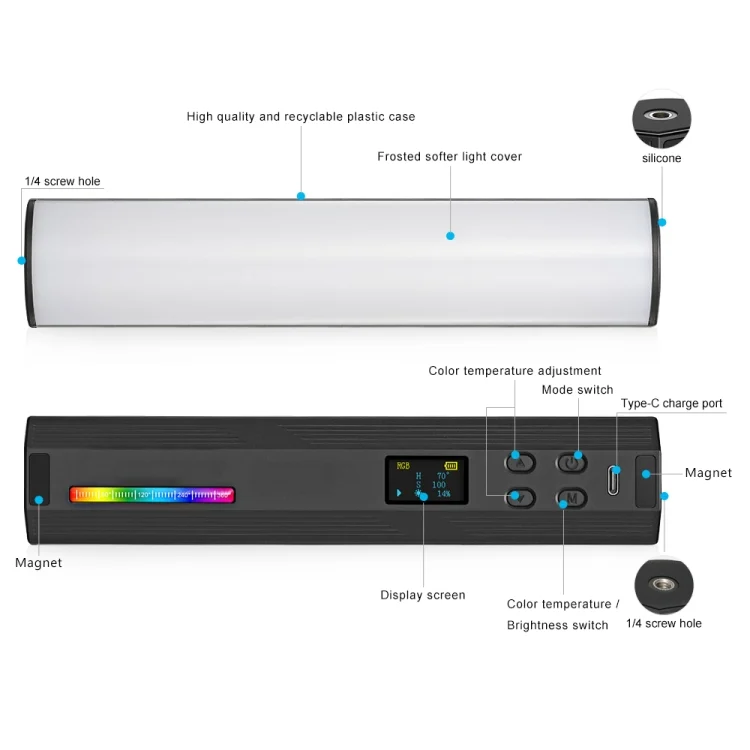 9. Standard 1/4 screw ports at both ends, can be connected to a light stand, tripod and other bracket use