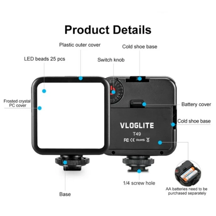VLOGLITE T49 Portable LED Video Light 5600K Photography Photo Lighting Panel Mini Fill Lamp