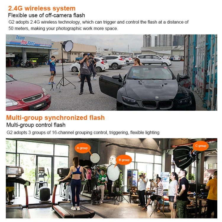13. Wireless system: The built-in 2.4G wireless G system can be used as the master or slave unit of the wireless multi-lamp flash system, making shooting simple and fast.