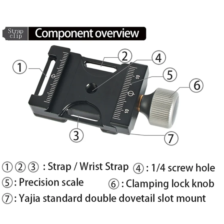 4. The quick release plate (38-39.5mm) can be clamped on the top of the clip seat, and the Yajia standard port double dovetail bayonet can be clipped on the side