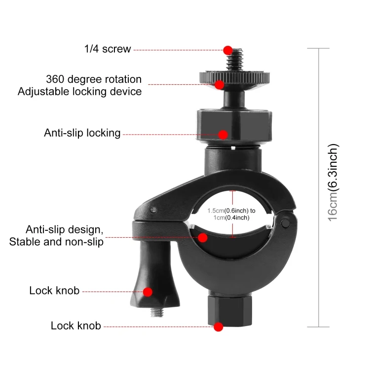 5. Phone clamp base and back each has a 1/4 inch screw holes,can connect to 1/4 inch screw of any device.