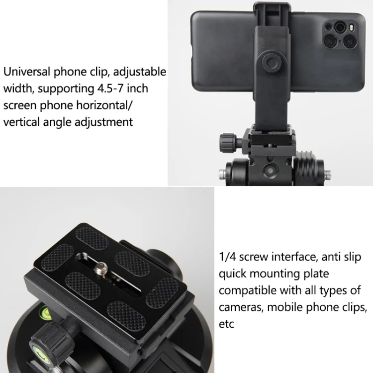 6. Non-slip quick release plate, 1/4 screw interface, compatible with various types of cameras, cell phone clips, etc.