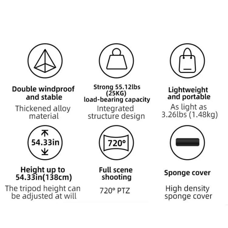 1. Material: Tripod tube is made of high-density high-strength aluminum alloy, which greatly reduces the weight of the product.
