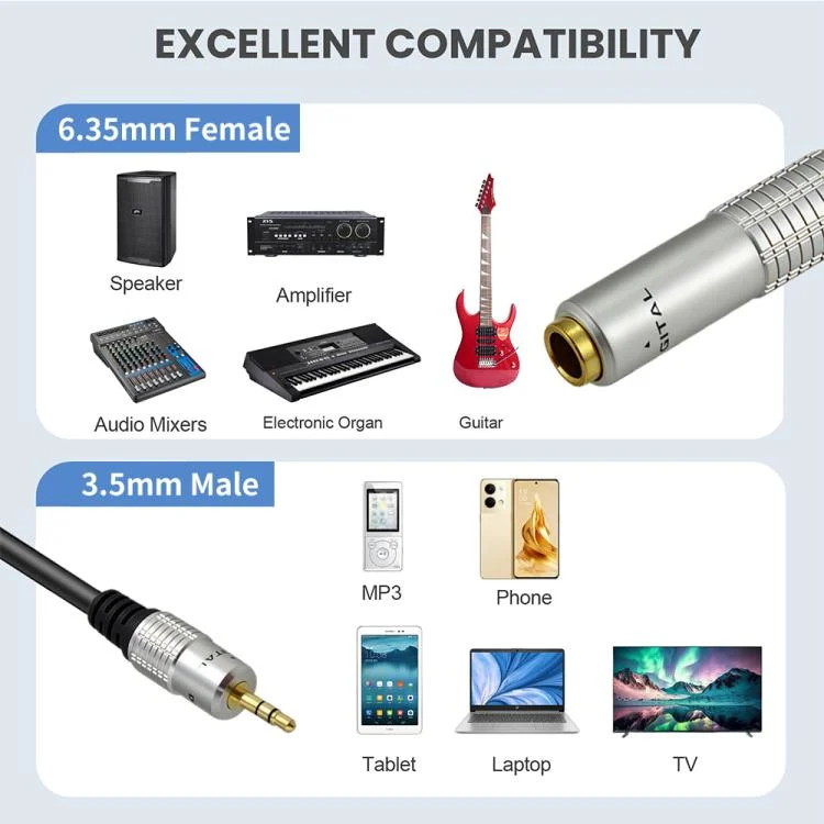 1. Universal 6.35mm to 3.5mm Adapter: The 1/4 to 1/8 adapter cable is designed to connect an amplifier, guitar, mixing console, piano, home stereo system, or karaoke system with standard 6.35mm plugs to audio devices with a 3.5mm stereo jack.