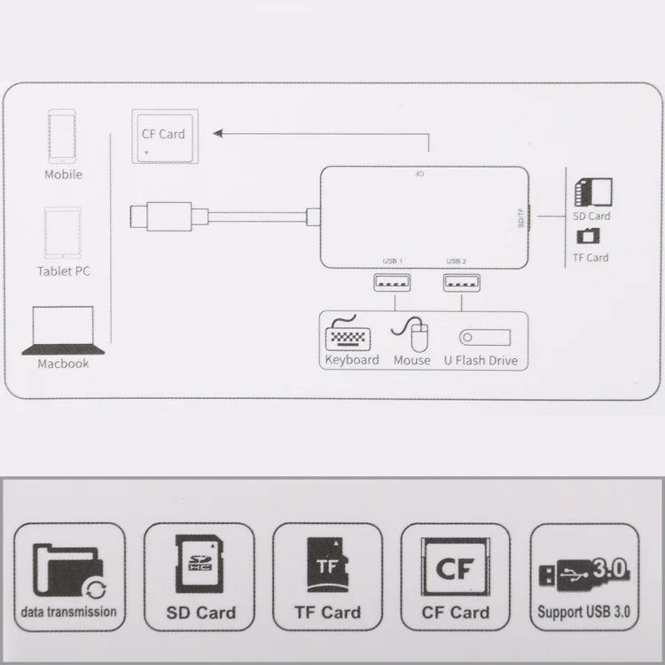 5 In 1 Dual USB 3.0 + CF + TF + SD Multi-function USB-C OTG Card Reader