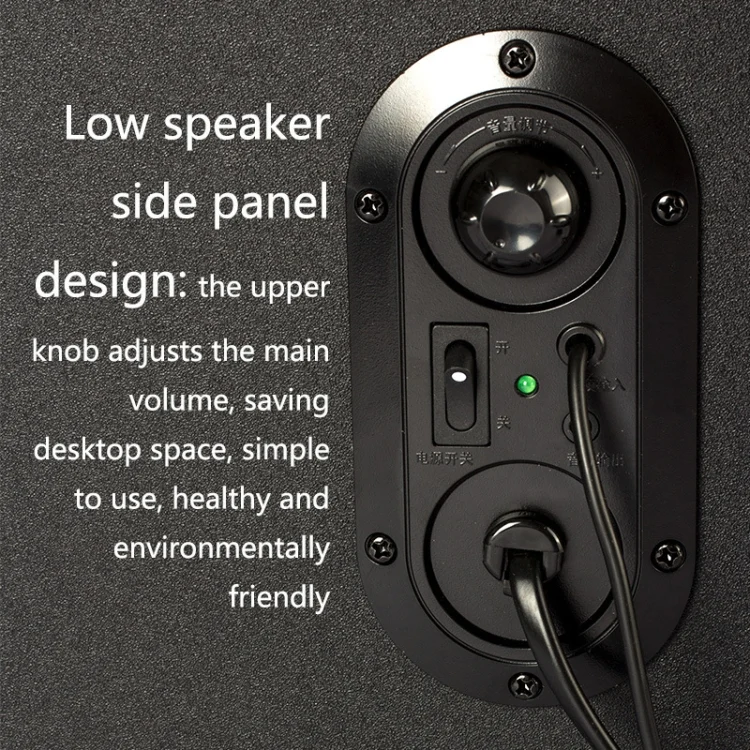 1. Low speaker side panel design: the upper knob adjusts the main volume, saving desktop space, simple to use, healthy and environmentally friendly