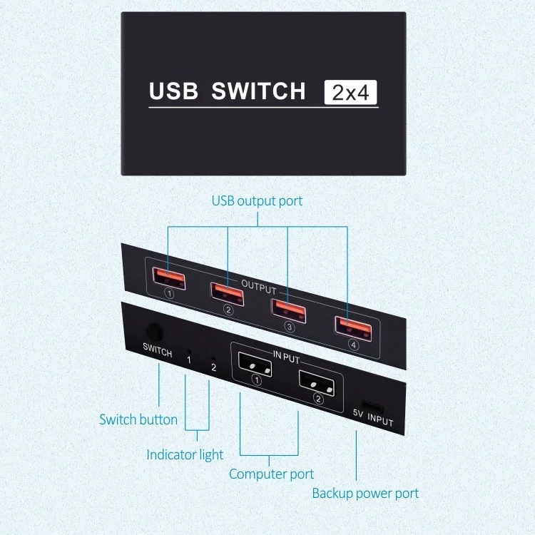 2×4 USB Switch 2 Port PCs Sharing 4 Devices for Printer Keyboard Mouse Monitor