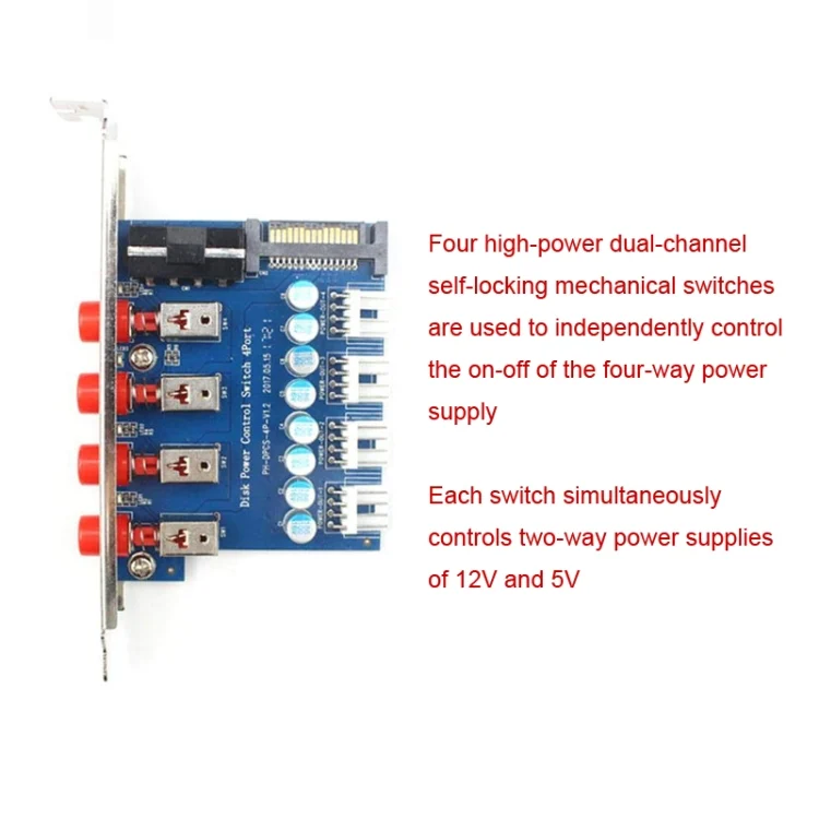 2. Four high-power dual-channel self-locking mechanical switches are used to independently control the on-off of the four-way power supply, and each switch simultaneously controls two-way power supplies of 12V and 5V