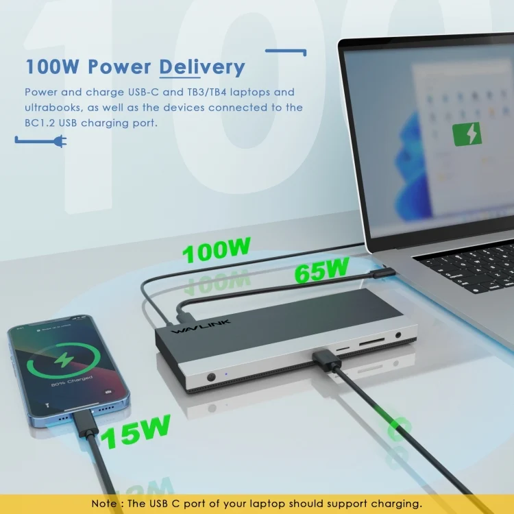 5.Charge your Laptop:This wavlink USB C Hub dock with 100W PD3.0 pass-through charging port, provides up to 65W power delivery to your laptop, quickly charging your connected devices while displaying or transferring data. A USB C Triple Display Docking Station for life, meet your different needs for home/office/outdoor screen expansion.