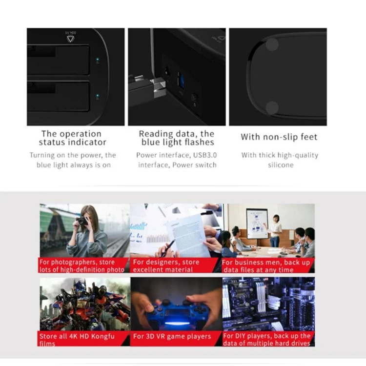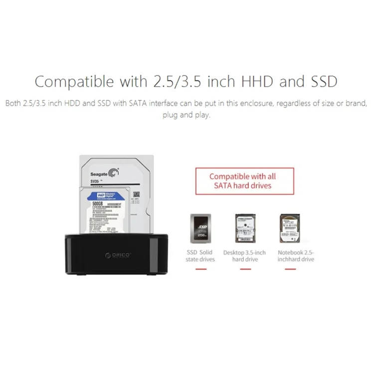 1.Both 2.5/3.5 inch HDD and SSD with SATA interface can be put in this enclosure, regardless of size or brand, plug and play