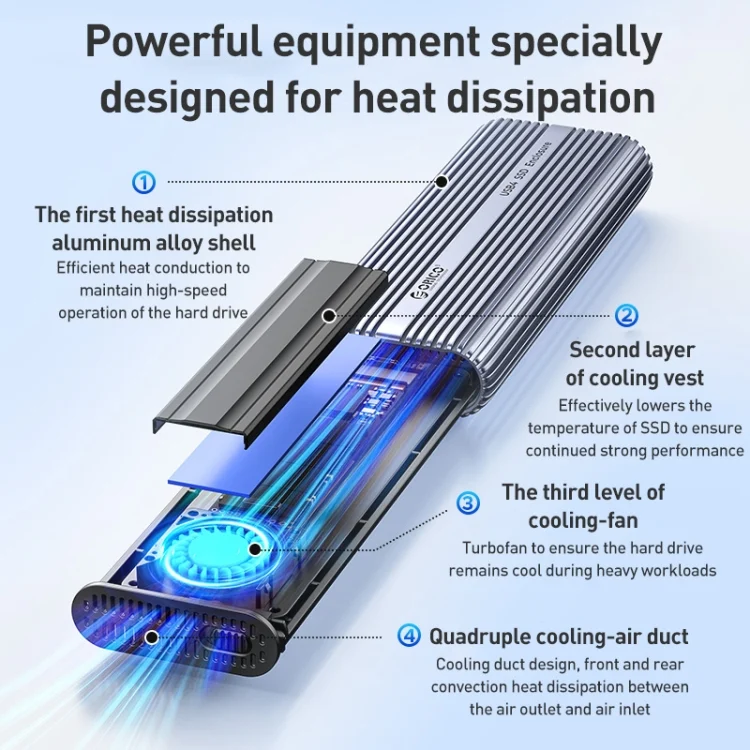 1. Adopt aluminum alloy shell and four-layer heat dissipation to maintain high-speed operation of the hard disk