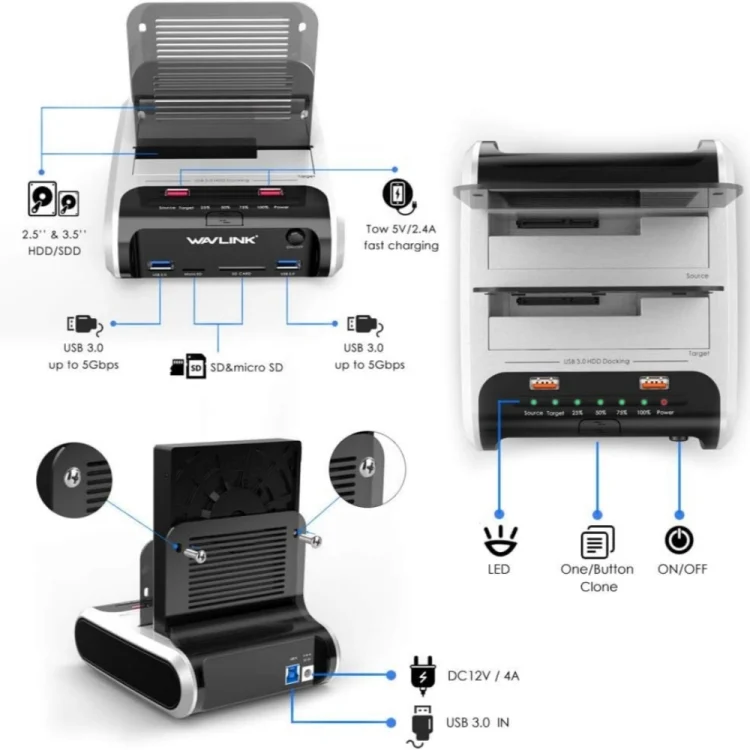Wavlink ST336A SSD HDD Fast Offline Clone SATA USB 3.0 External Hard Drive Case