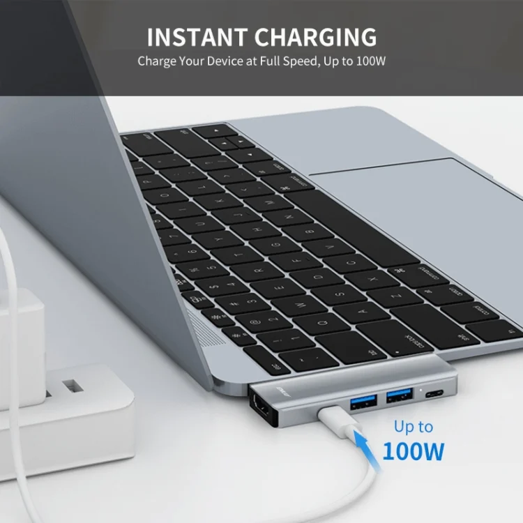 4.High-speed charging: Support PD charging at max 100W. This multiport USB C adapter provides one Type-C pass through Female port by which you could securely charge while connecting multiple peripherals for data transferring and worry-free power storage. (Ps: the Type-C PD charging port is only applicable to devices with PD Protocol)