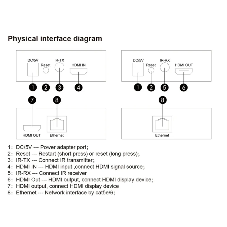3. Use Category 5 or Category 6 (recommended) network cable instead of HDMI cable to connect the transmitter and receiver of the extender, the maximum transmission length of 150 meters