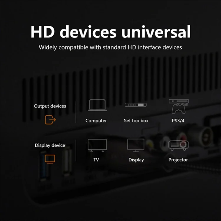 4. Applicable equipment: Compatible with version 2.0 and below. Equipment with standard HDMI interface, connected to projectors, TVs, computers, set-top boxes, suitable for PS4 video games, etc.