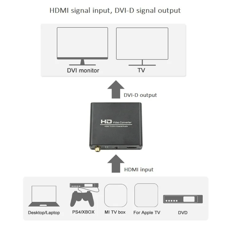 The HDMI to DVI is a high-definition video converter which convert HDMI digital signal to DVI-D digital signal and analog audio or digital audio signal. HDMI signals connection PS3, XBOX360, Blu-ray DVD, HD set-top boxes, CRT / LED Display etc. You can easy to watch HD Video on the normal TV which without HDMI Interface.