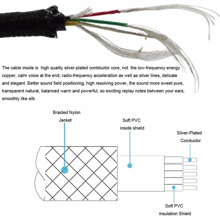 2. The wire is made of 20-core OFC oxygen-free copper wire, and the outer layer is added with a cotton shock-absorbing net to effectively reduce the stethoscope effect, shield interference, and improve the overall sound quality.