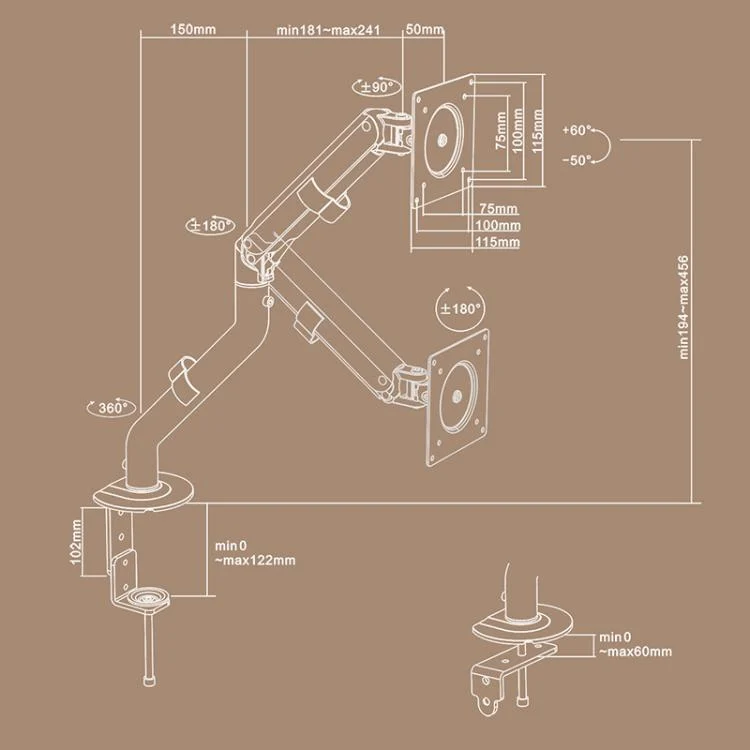 3. 90-degree Tilt Adjustment: Up/down tilt angle range of +60 to -45 degrees. Front-back extension range: 0–590 mm. Height adjustment: 194–456 mm. One-click switching between horizontal and vertical screens for full-angle control!