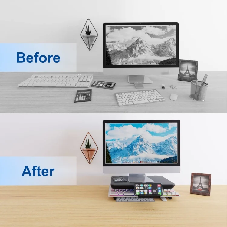 4. The monitor stand consists of an ABS platform and metal hinges, which can easily support 17-32-inch computer monitors, laptops, etc.