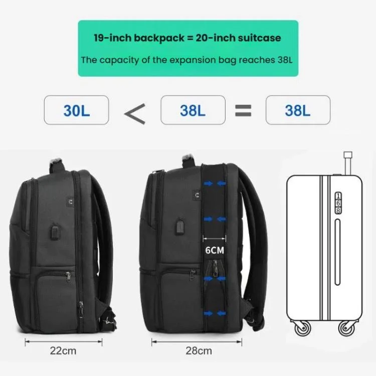 1. Expandable up to 39L: Expandable width by 6cm with inverted V-shaped zipper design, achieving 30% capacity increase. (Standard 15.6-inch version cannot be expanded.)