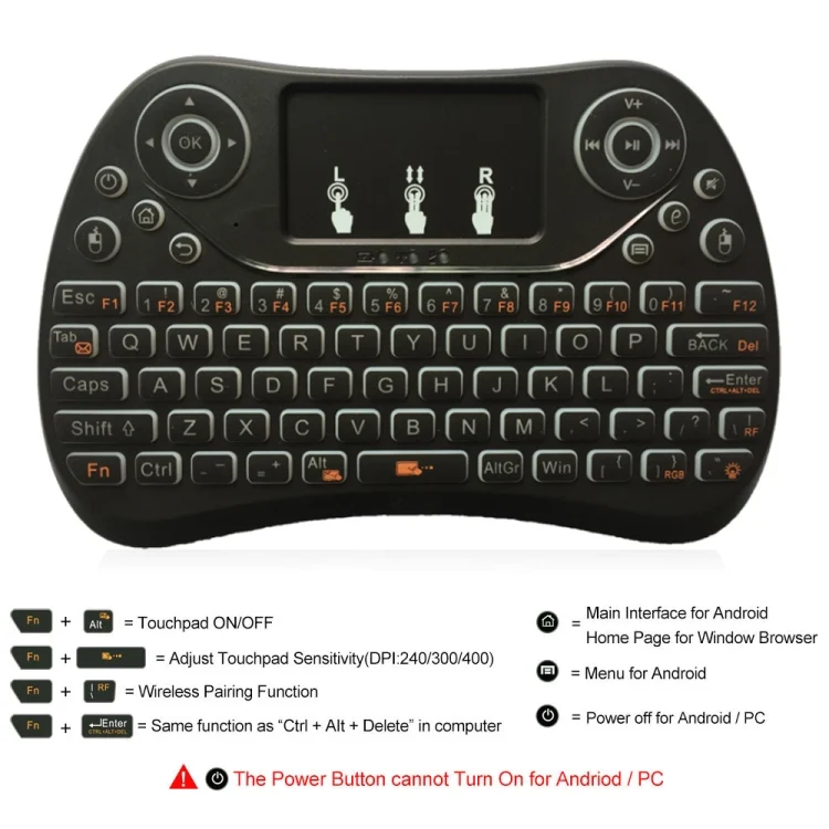 1.Mini Wireless Keyboard with Touchpad Rechargeable Fly Air Mouse 2.4GHz Smart Game three-color Backlit Keyboard for Android Computer TV PC Case