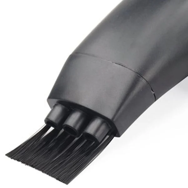 Includes brush for stubborn material and getting between keys and flexible rubber nozzle.