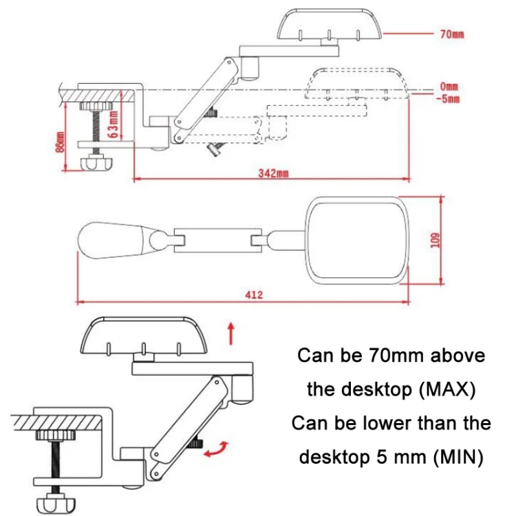 2. Liftable model: can be higher than the desktop 70 mm (MAX), can be lower than the desktop 5 mm (MIN)