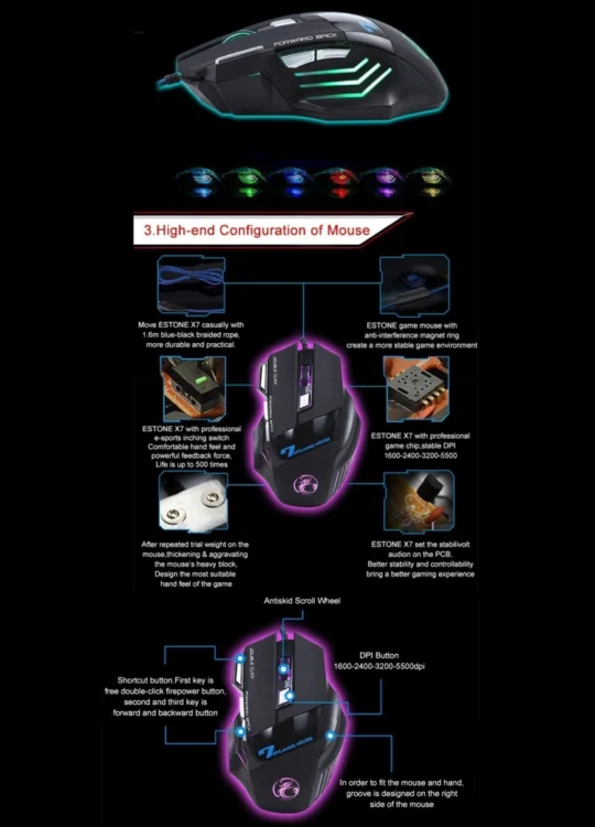 7 Buttons with Scroll Wheel 5000 DPI LED Wired Optical Gaming Mouse for Computer PC Laptop