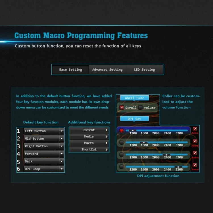 4. Adjustable DPI Switch: 1200-1600-2000-2400-3200 DPI.