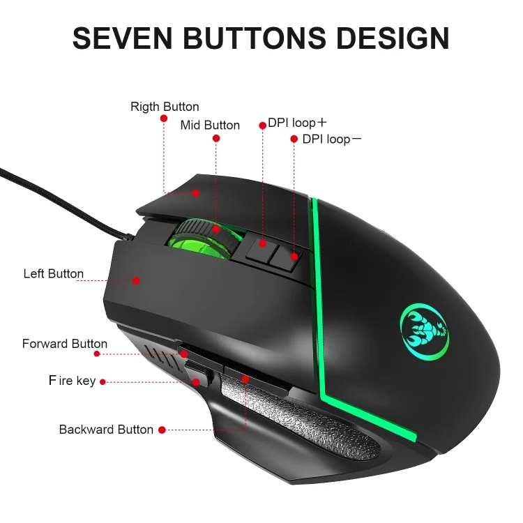 6. 8 buttons (Left, Right, Middle,forward,back,DPI +/DPI-,fire key)