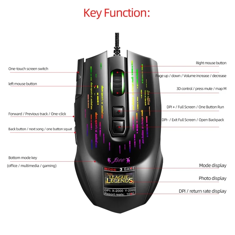 HXSJ J500 7 Keys RGB Programmable Display Screen Gaming Wired Mouse