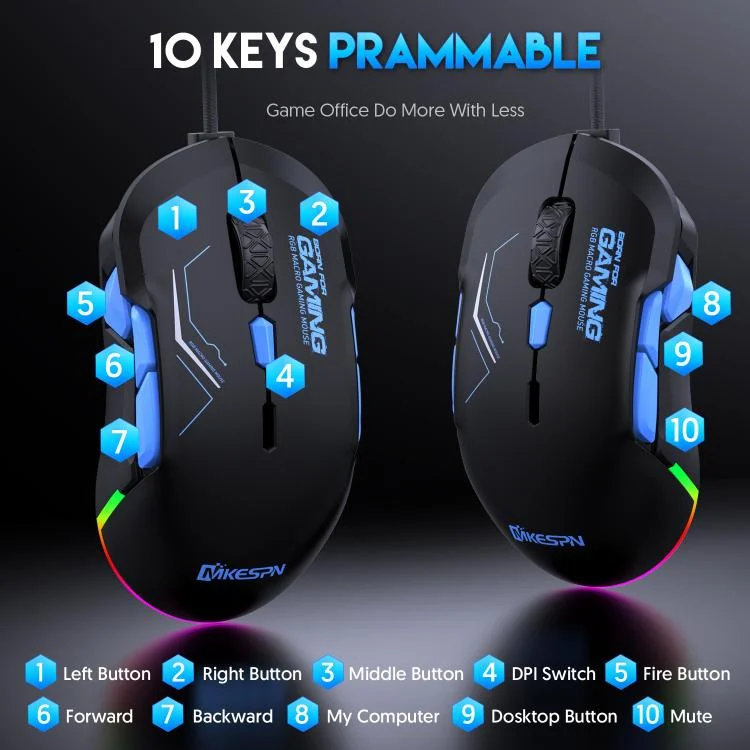 MKESPN 12800 DPI Ambidextrous Wired Gaming Mouse – 10 Programmable Buttons, RGB Customization, Symmetrical Design
