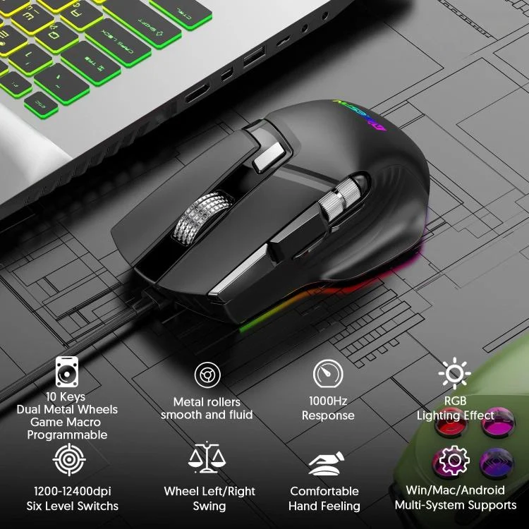 1. A high-performance RGB wired gaming mouse designed for gamers, featuring 12400 DPI sensitivity, 10 programmable buttons, dual scroll wheels, and customizable RGB lighting. Built with ergonomic comfort and adjustable settings for versatile gameplay.