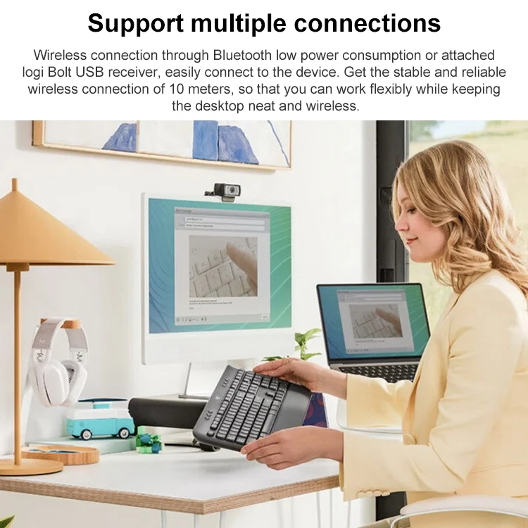 5. Connecting to your devices is a breeze, thanks to wireless connectivity via Bluetooth Low Energy or the included Logi Bolt USB receiver. Get a strong reliable wireless connection from up to 10 meters 9Wireless range may vary based on user, environmental, and computing conditions. that lets you stay flexible with where you work while keeping your desk tidy and wire-free.