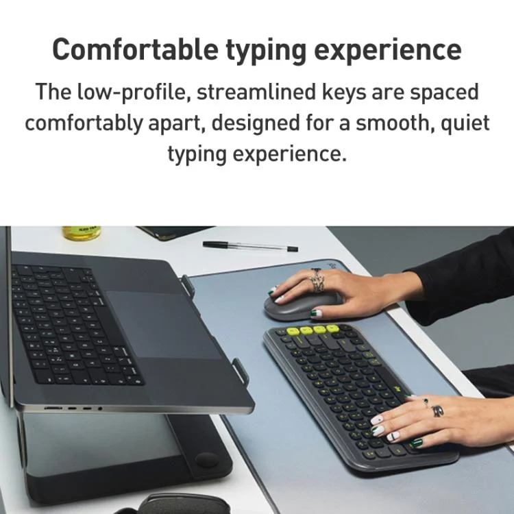 1. Low-profile switches and streamlined keys are comfortably spaced, designed for a smooth, quiet typing experience.