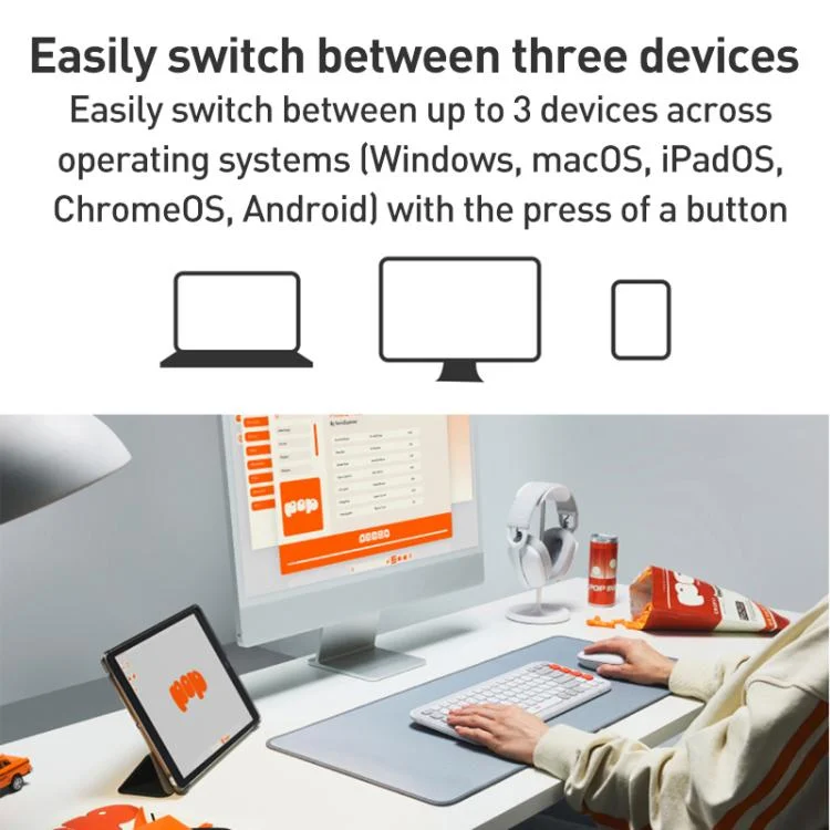 6. Easily switch between up to three devices across operating systems (Windows, macOS, iPadOS, ChromeOS, and Android) with the press of a button. 7. Case Material: PBT + PC