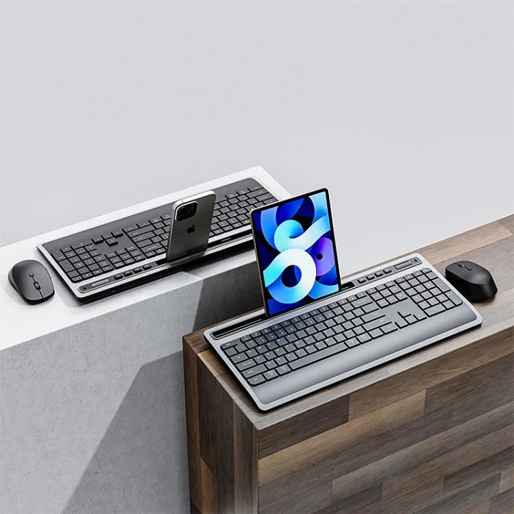 1. This wireless keyboard & mouse set is designed for business office and multi-tasking scenarios, featuring an ergonomic wrist rest and integrated tablet/smartphone slot to balance efficient work and entertainment needs.