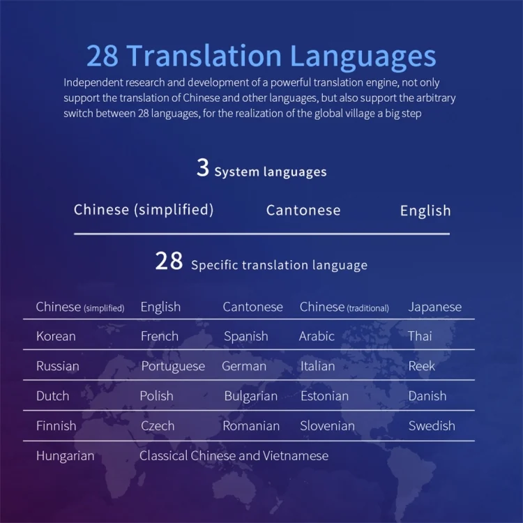 5. Translation in 28 languages (Simplified Chinese, English, Cantonese, Traditional Chinese, Japanese, Korean, French, Spanish, Arabic, Thai, Russian, Portuguese, German, Italian, Greek, Dutch, Polish Language, Bulgarian, Estonian, Danish, Finnish, Czech, Romanian, Slovenian, Swedish, Hungarian)