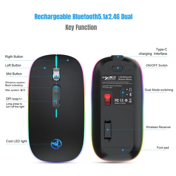 HXSJ M103FG 1600dpi Adjustable 2.4G + Bluetooth RGB Light Wireless Mouse
