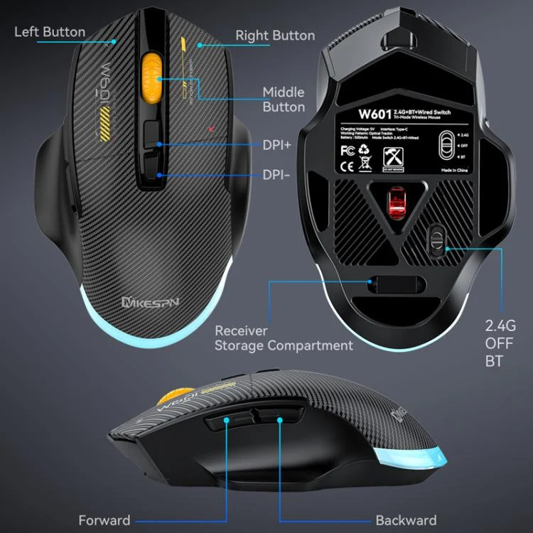 MKESPN W601 Silent Wireless Tri-mode Macro Gaming Mouse Carbon Fiber 12800DPI Bluetooth Mouse